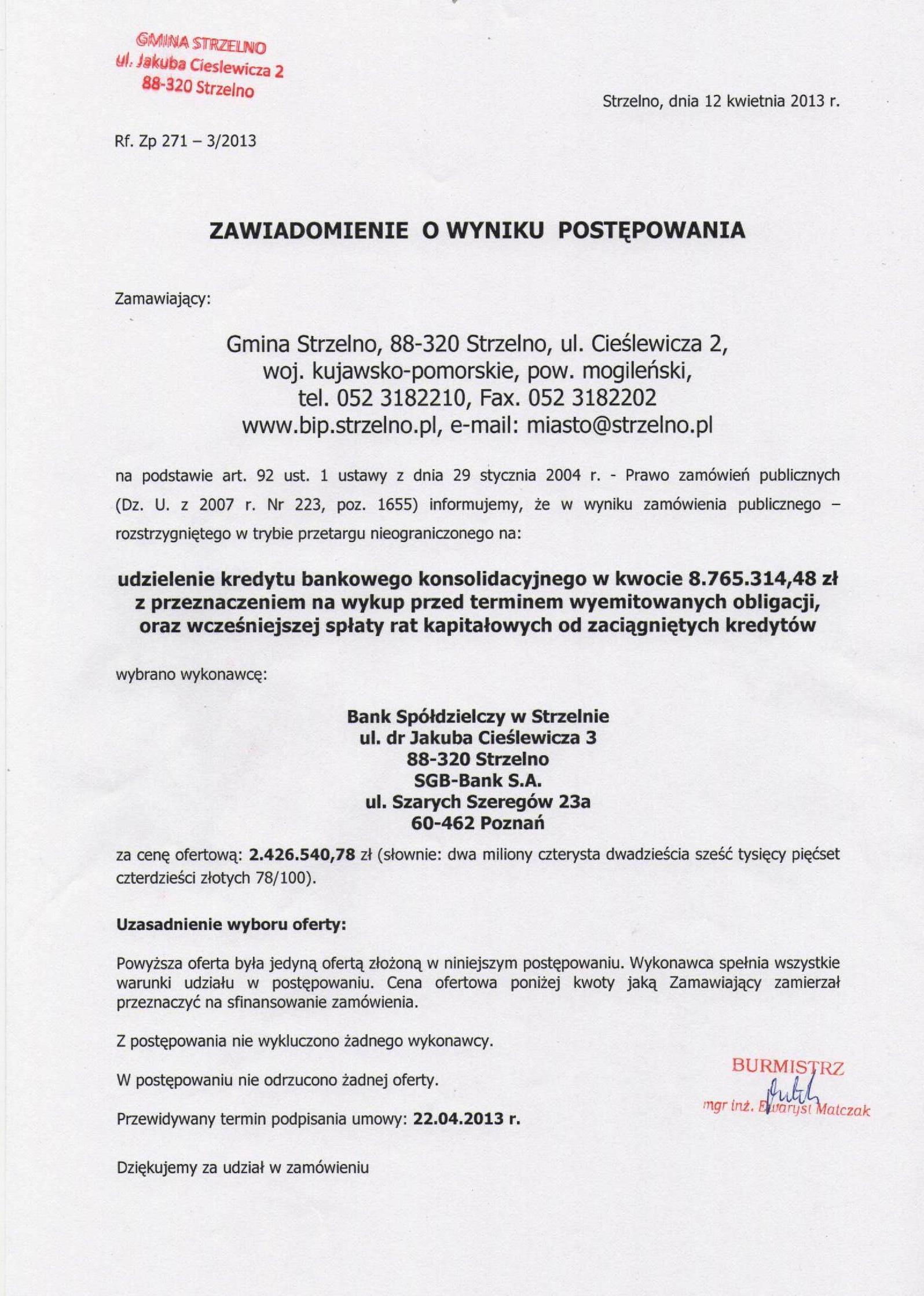 Zawiadomienie o wyniku postępowania przetarg nieograniczony na Udzielenie kredytu bankowego konsolidacyjnego w kwocie 8.765.314,48 zł