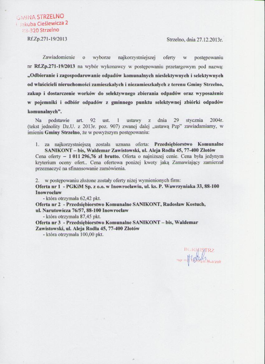 Zawiadomienie o wyborze najkorzystniejszej oferty przetarg nieograniczony na: "Odbieranie i zagospodarowanie odpadów komunalnych nieselektywnych i selektywnych od właścicieli nieruchomości zamieszkałych i niezamieszkałych z terenu Gminy Strzelno...