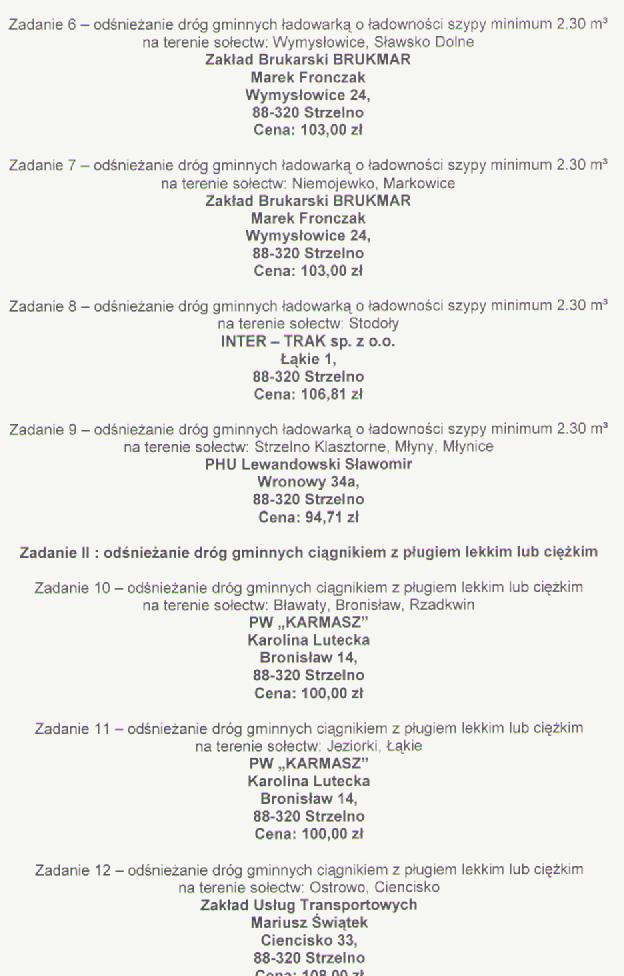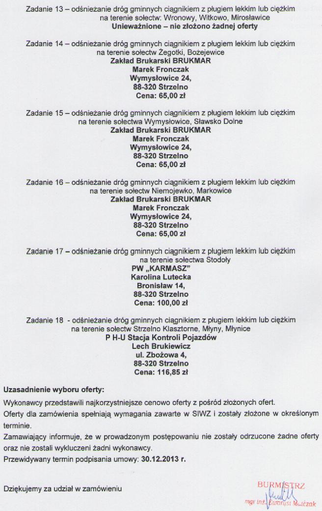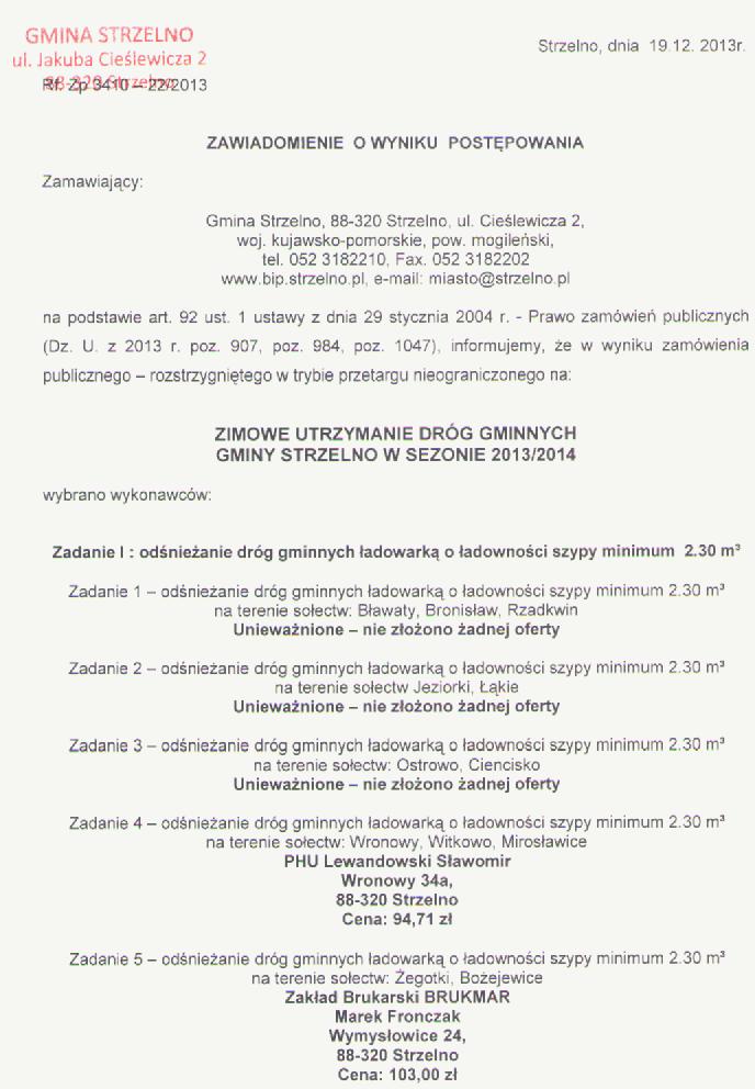 Zawiadomienie o wyniku postepowania przetarg nieograniczony na: "Zimowe utrzymanie dróg gminnych Gminy Strzelno w sezonie 2013/2014